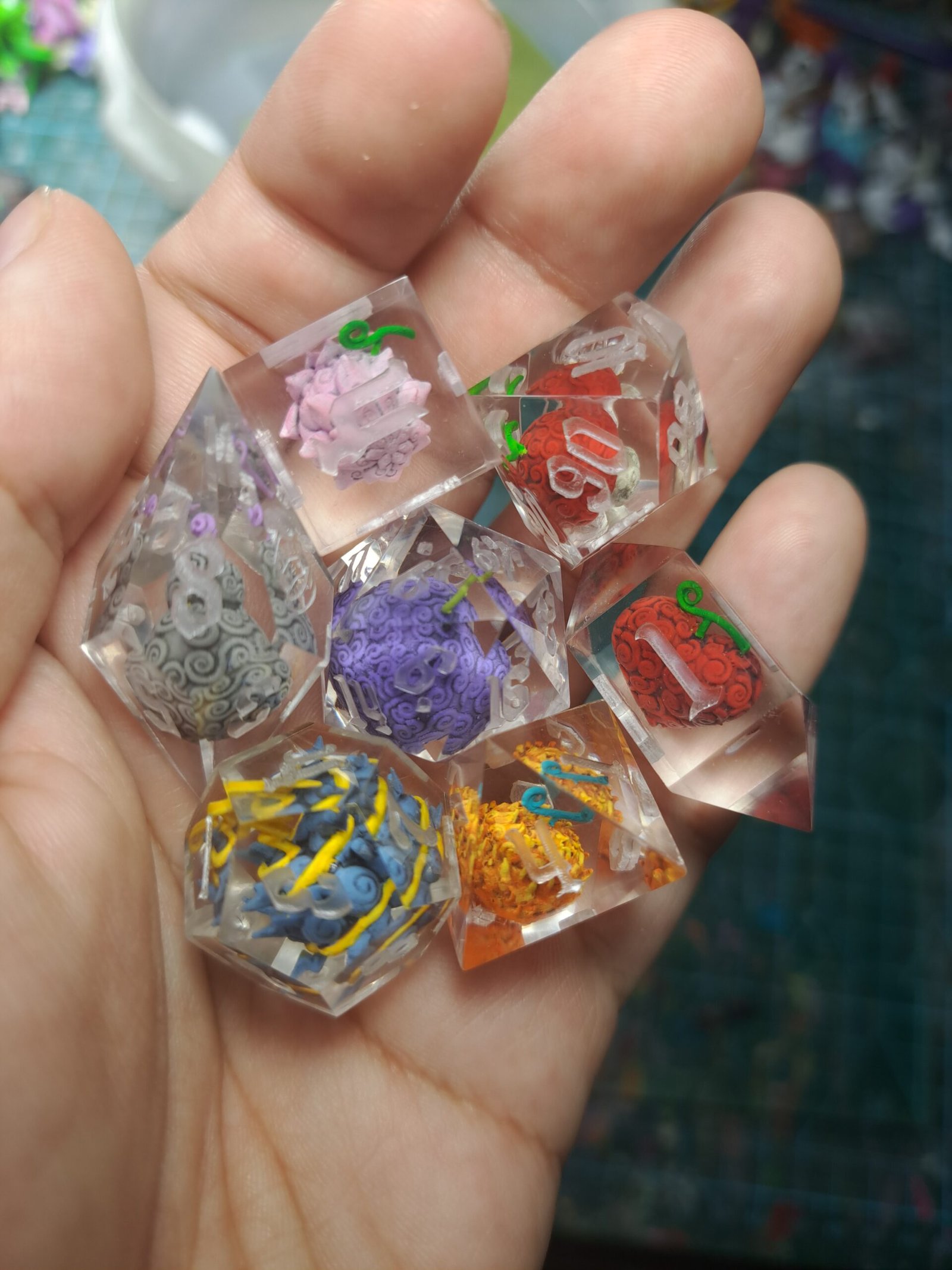 Dice set inspired by the demon fruits from One Piece (akuma no mi)